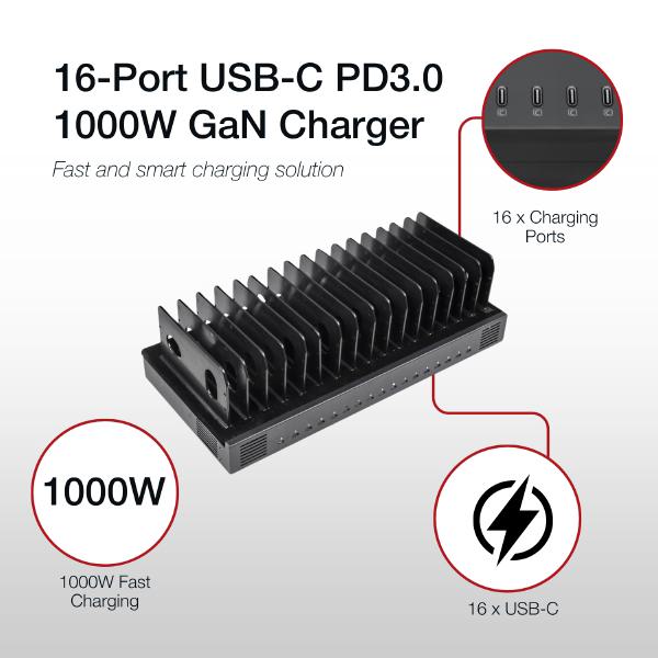 Maximise productivity with a powerful 1000W charging station that can simultaneously charge up to 10 Macbooks at 100W, 16 Notebooks at 60W or a combination of smartphones, tablets, and USB-C devices.