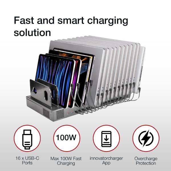The Shintaro 16-Port USB-C GaN Charger delivers an impressive 1000W of total power, enabling simultaneous charging of up to 10 MacBooks at 100W each or 16 devices at 60W. Powered by advanced GaN (Gallium Nitride) technology, it offers faster, more efficient charging in a compact design.Ideal for homes, offices, or classrooms, this high-performance charging station supports a wide range of devices including smartphones, tablets, and laptops. With 16 USB-C PD 3.0 ports and a clean, organised layout, it eliminates workspace clutter. The InnovateCharger App gives you full control, allowing you to optimise and oversee all charging activity while benefiting from integrated safety protections.