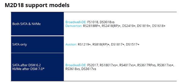 Both SATA nd NVMe – FS1018, DS3018xs, RS2818RP+ , RS2418+ , RS2418RP+ , DS2419+, DS1819+, DS1618+
