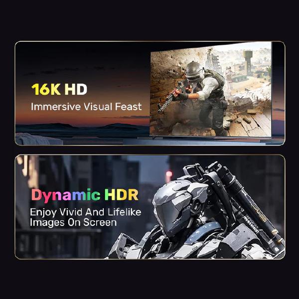 This UNITEK 16K DisplayPort 2.1 supports high resolutions up to 16K, (15360*8640)@60Hz with DSC, 8K@120Hz, 4K@240Hz/ 165Hz/ 120Hz/ 144Hz, 2K@360Hz. UNITEK 16K DP 2.1 cable meets the VESA Standard. Our cable is backward compatible with DisplayPort 2.0 and older versions, it supports dynamic HDR, HDCP 2.2, DSC1.2a with refresh rate up to 240Hz. It also offers flawless audio pass-through for uncompressed digital audio channels at 7.1, 5.1 and 2.0, complemented by 3D stereo imaging technology, to enhance your immersive entertainment and gaming experience.